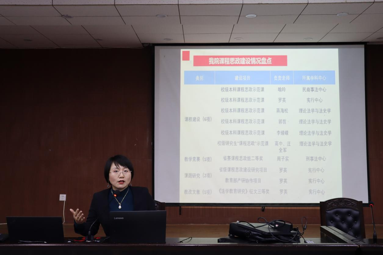思政课程建设应当跳出思维定势,结合学校的特色文化积极挖掘教学素材和案例,比如结合时务学堂、李达校长与法学的渊源等素材,结合院史校史,融入人生态度、科学精神、社会责任、家国情怀等价值观,实现全程育人,做到润物细无声。她还介绍了法学专业课程思政研究中心筹划情况及未来开展工作的重点方向。