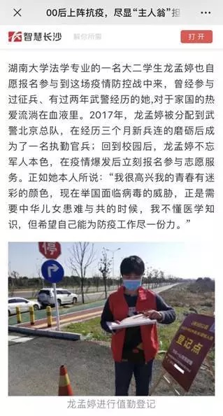 龙孟婷守在人流车流较大的地方,量体温、报告发烧症状者、限制外来车辆进入,做好每一次的询问与登记。“在军队时我也是一名执勤哨兵,在午夜万籁俱寂时,即使有些难忍,想到自己是在为国家做贡献,就觉得很自豪。现在做志愿者虽然衣服不一样、场地不一样、原因不一样,但为国家为社会贡献一份力的自豪又涌上心头。”