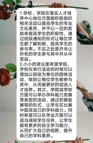 班会活动以七名班委和十名入党积极分子为主体,其他同学共同参与,发言人针对我校课程设置、招生政策、学校知名度等问题提出相对合理的建议,同时,重点阐述了学校在学生管理、教师资质、基础设施供给方面的问题。班会活动收集到不少有建设性的意见: