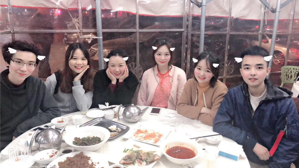 上完专业课,几个同学相约海鲜大排档,有说有笑,合影留念。