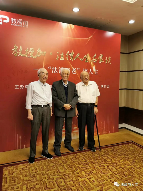 蒋海松副教授在开场白中说,三老都是德高望重,年高德劭,平均年龄应该是90高龄了。法学界拥有三老,则是法界盛事,国之至宝。人们尊称法治三老,不仅仅是因为他们高寿年长,更是因为他们敢于担当,敢于发声,在历史的重要关口总是发出法学界的最强音,影响了一代又一代法律人。郭老因此被誉为“时代的良知”,法律思想家,江老是“中国法学的良心”,“一生只为真理低头”,李老被誉为“敢开法治第一腔”,是人权法的旗手。
