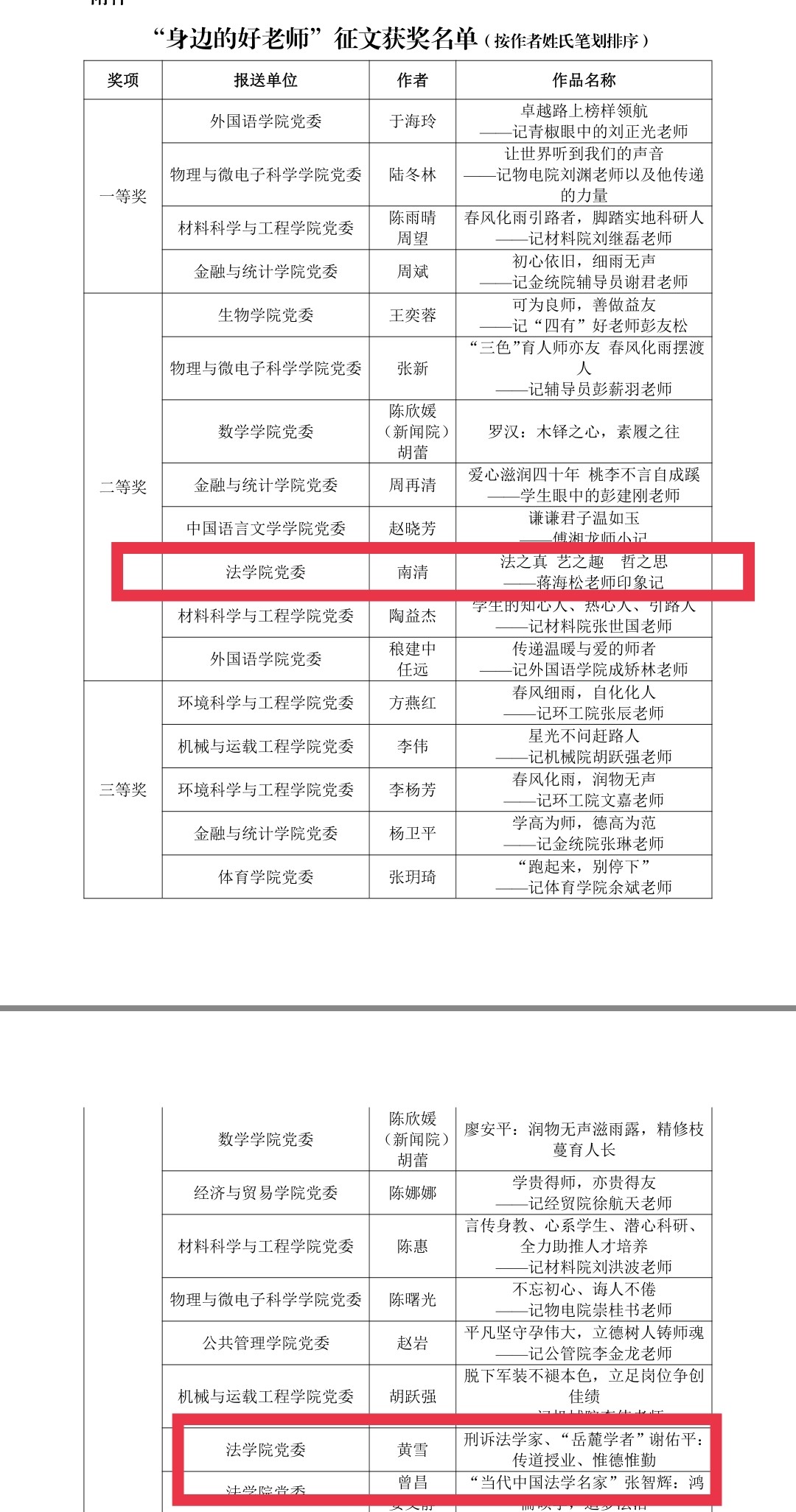 报送了近十篇稿件,其中《法之真艺之趣哲之思——蒋海松老师印象记》(作者南清)获得二等奖,《刑诉法学家、“岳麓学者”谢佑平:传道授业,惟德惟勤》(作者黄雪)、《“当代中国法学名家”张智辉:鸿儒硕学,追梦法治》(作者曾昌、娄文静)荣获三等奖。调教动漫