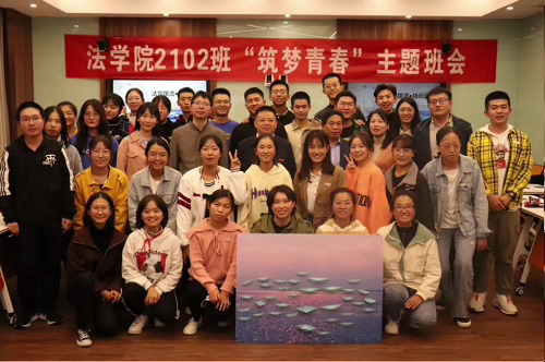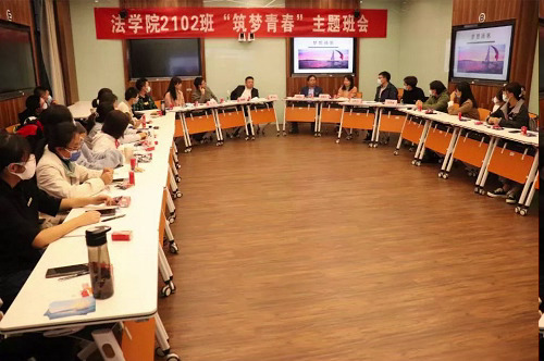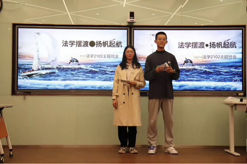 2021级本科生辅导员张丹、2021级迎新团队成员金博涵及法学2102班全体同学参会。本次班会由调教动漫