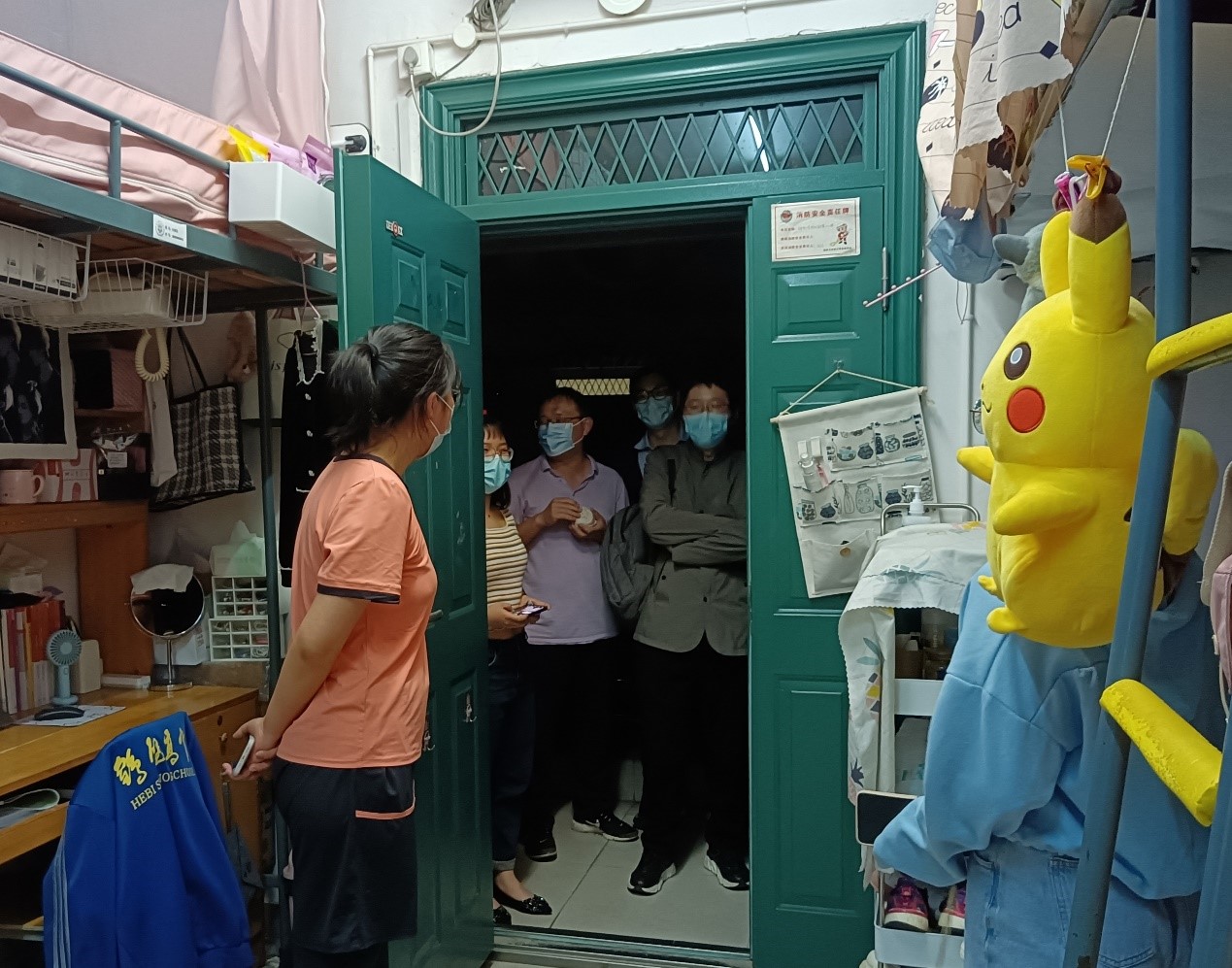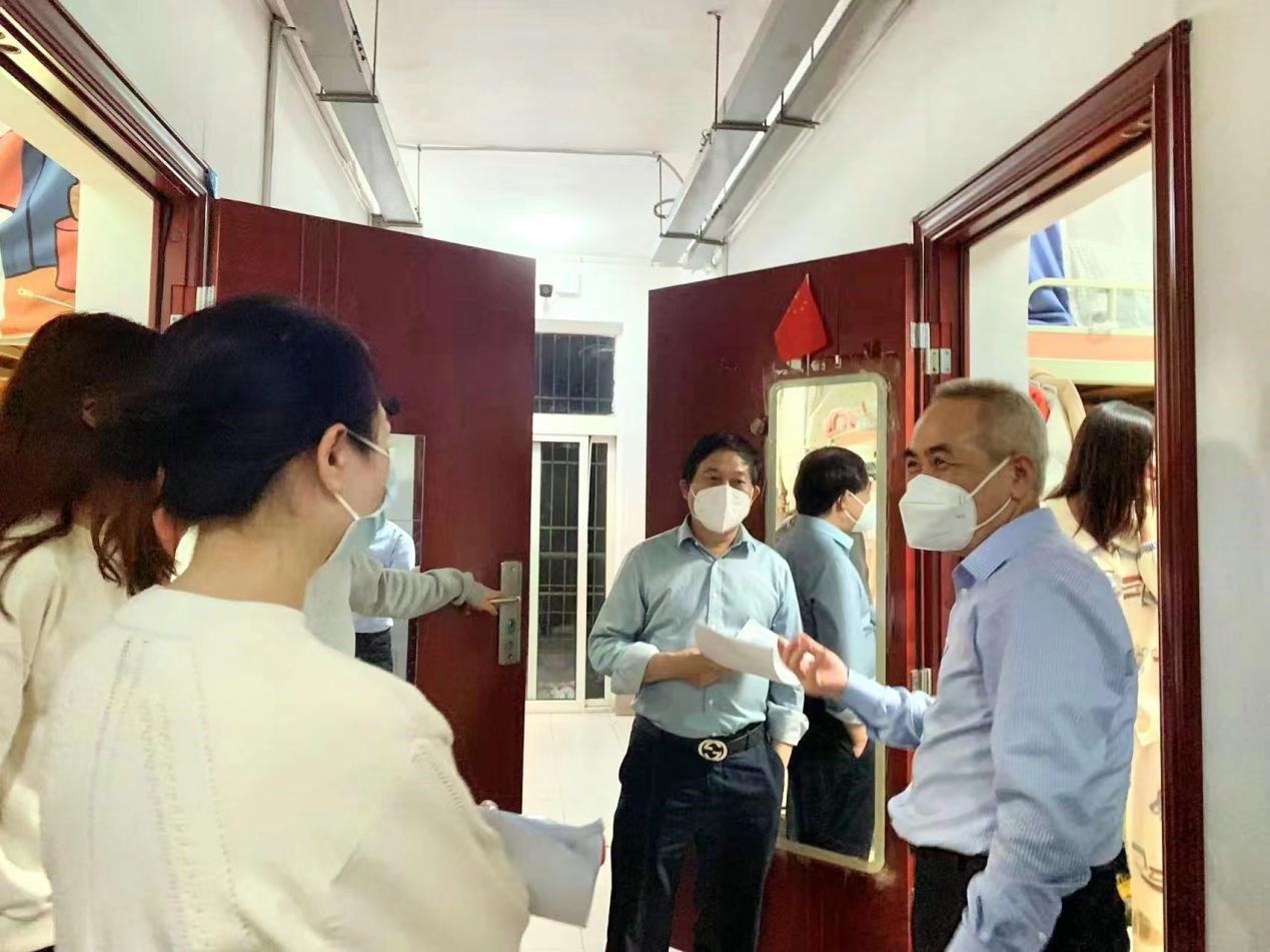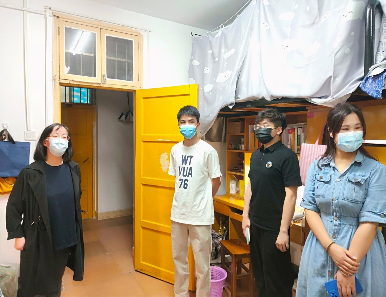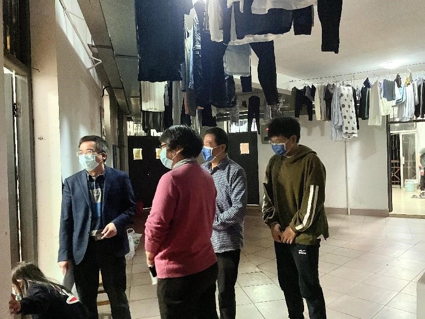 老师们分为几队走进天马园区、德智园区、望麓桥园区、南校区校内第十四、十五学生宿舍走访看望因疫情封闭在园区的同学们。参加走访的老师有:调教动漫