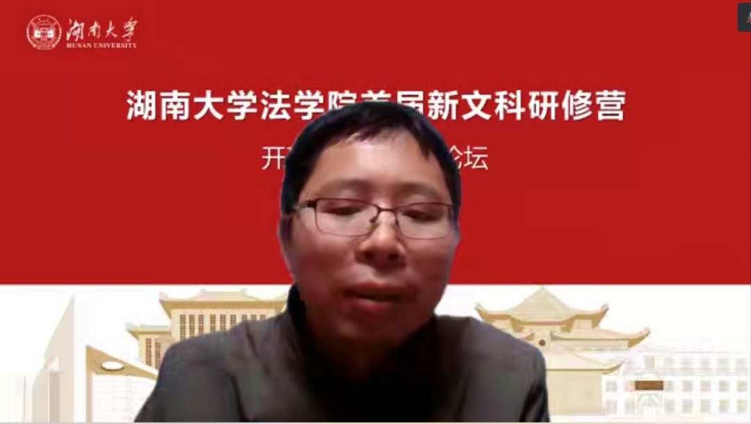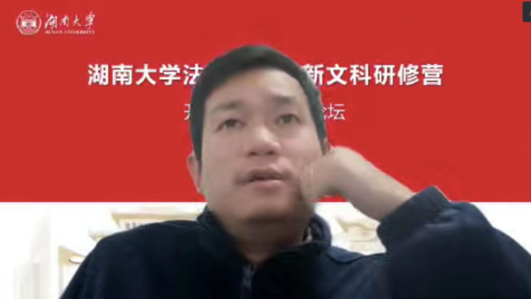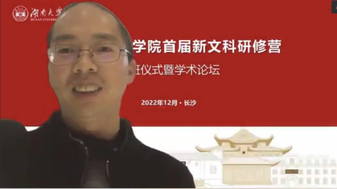 校外专家发言完毕后,湖大研习营带班班主任发言。本科研修班班主任王聪老师认为,在新文科这一热点背景下,每个人都是新生。作为老师,他们也和学生一同学习、一起成长。新文科这一理念已经从理论走向了实践,区分旧文科与新文科有重要意义。他结合本科期间的经历,谈到作为交叉学科的新文科对学科选题壁垒以及人才分割等问题的突破。面对新时代浪潮,王中老师借用王汎森先生“天才成群而来”,呼吁进一步凝聚共识,形成“新文科共同体”,在新文科领域内一起学习奋斗。