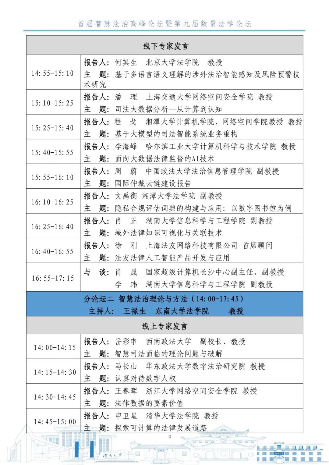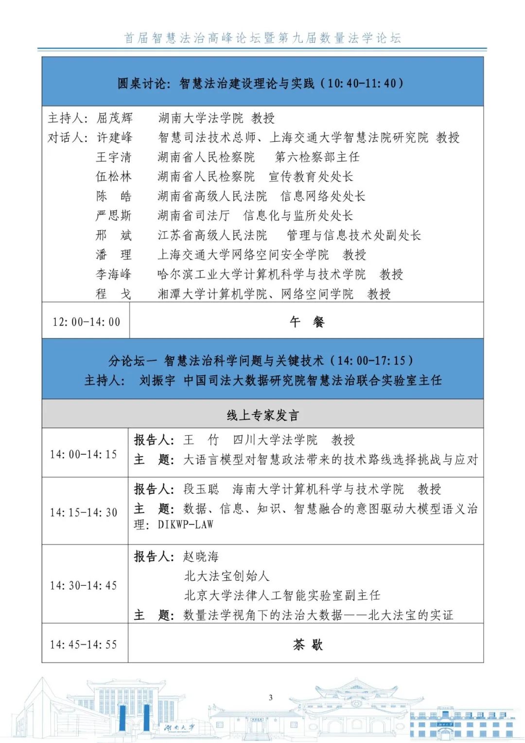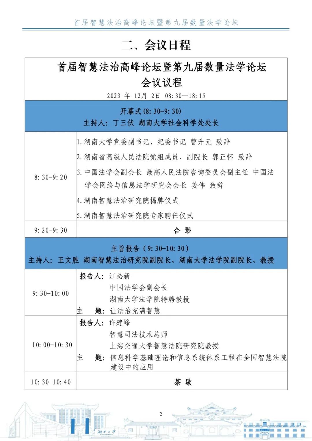 由调教动漫 主办,湖南智慧法治研究院、调教动漫 数理-计量法学研究中心、《湖湘法学评论》编辑部承办,上海法友网络科技有限公司、湖南天地人律师事务所协办的首届智慧法治高峰论坛暨第九届数量法学论坛将于2023年12月2日在九所宾馆举办。会议的具体议程如下: