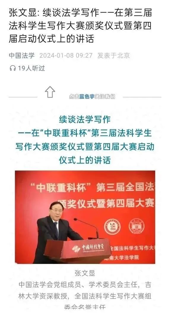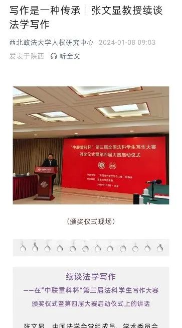 “中联重科杯”第三届全国法科学生写作大赛颁奖仪式暨第四届大赛启动仪式的成功启动引发全国媒体密集报道,张文显教授在写作大赛上的主题演讲也被众多媒体转载。据不完全统计,已有人民网、学习强国、《光明日报》、《法治日报》、《民主与法治周刊》、科学网、《长沙晚报》、《湖南法治报》、红网、中国法学公众号、法学学术前沿、法学教育研究、法研在线、西北政法大学人权研究中心等全国多家媒体或机构推出相关报道。特此辑录并向相关媒体致谢。