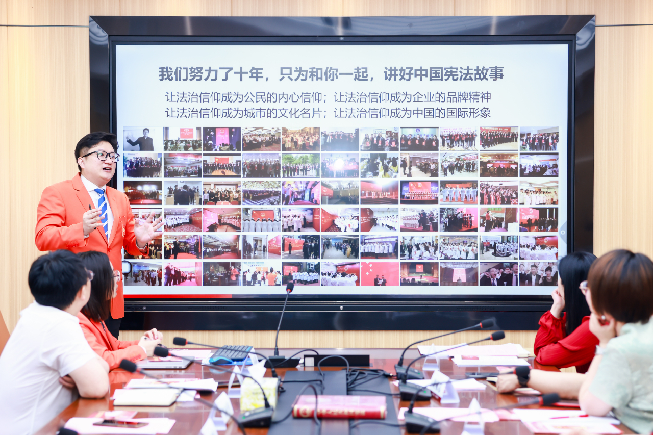 尊法宣誓馆创设人、尊法文化发起人何俊锋律师介绍了其团队开展尊法爱国文化活动的行动方案、初心愿景以及取得的成果。他提到,其所在团队当前在全国各地持续推广尊法爱国文化活动,取得的积极的社会效果。自2014年以来,在民间组织累计举办了1000余场尊法宣誓活动,同时建立了互联网线上尊法宣誓及宣传平台,并拍摄了第一部尊法宣誓主题微电影《信仰》,在多地建立了尊法宣誓馆和尊法宣誓广场。他表示,希望能够广泛联合企事业单位和各界爱国人士,共同推进尊法爱国感召行动,宣扬宪法精神。要落实《爱国主义教育法》,把宪法教育与爱国主义教育有机结合起来,以宪法教育激发爱国热情。他也系统介绍了“党员带头、干部示范、企业支持、全民参与、法治护航”的全民尊法“五位一体”整体方案,最后他呼吁各界积极进行尊法宣誓,传递尊法爱国的信仰。