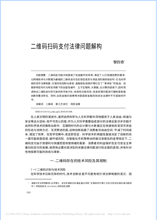论文指出, 二维码支付极大地提高了资金循环的效率,满足了人们快捷消费的需求。然而,文明的另一面往往是训戒、奴役与限制。以网络技术与大数据为基础的二维码支付在实现信息流与资金流的高效结合时,它也对传统的货币法律制度、交易风险控制与承担、金融隐私权保护等衍生了“革命性”的挑战。创新即特定时代与特定场景下的创造性破坏。立于互联网、大数据、云计算的语境下,因时而进地对二维码支付所引发的货币电子化、未授权交易风险、信息权等问题进行解构是制度创新的重点所在。同时,全民金融扫盲教育亦是国家金融风险综合治理中不可或缺的环节。