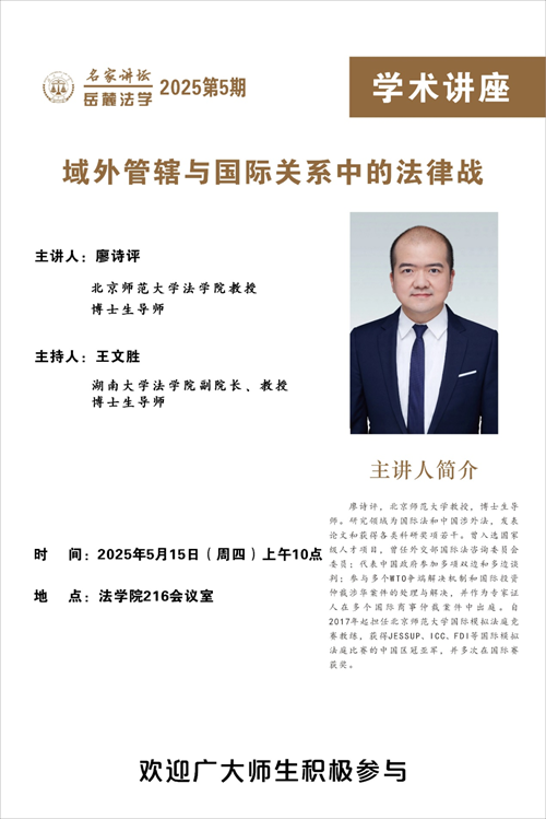 “岳麓法学名家讲坛”,以“域外管辖与国际关系中的法律战”为主题,结合美国法和中国法之间的异同来进行分析,深入解析了当代国际法背景下的域外管辖与国际关系之间的法律事务现状及其内在逻辑。讲座由调教动漫