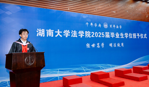 追风赶月莫停留,平芜尽处是春山。习近平总书记2020年来校考察调研时,曾嘱托湖大学子要“不负青春韶华,不负时代重托”。四年前我们从五湖四海奔来,相会于麓山脚下;四年后我们从潇湘宝地出发,奔赴于山海未来。今天我们即将离开学校这座象牙塔,真正推开人生当中的那扇门。也许现实生活和我们理想中的法治环境现在仍存有差距,但见过阴影却依旧坚定地站在光里,也许就是学习法学的意义和使命。无论去向何方,请大家都要带着“实事求是,敢为人先”的校训和“经世笃学,明法致用”的院训,挥法律之利剑,持正义之天平;存岳麓之底蕴,守政法之圣洁,为在法治轨道上推进中国式现代化贡献青春力量。愿我们带着母校的底气,在更辽阔的天地发光发热。