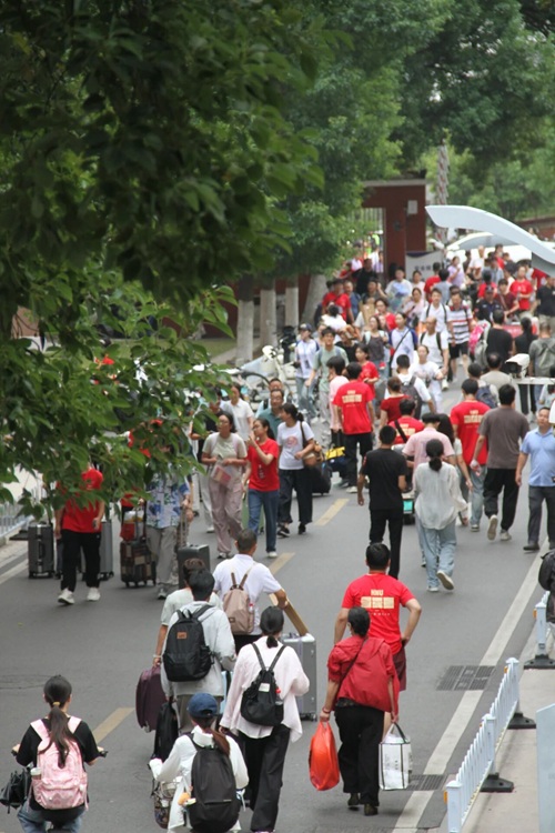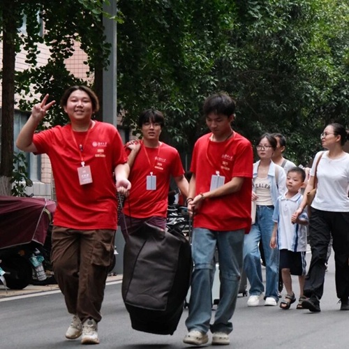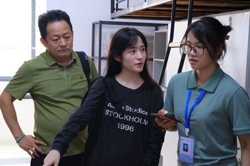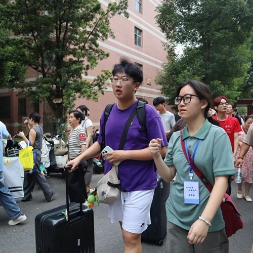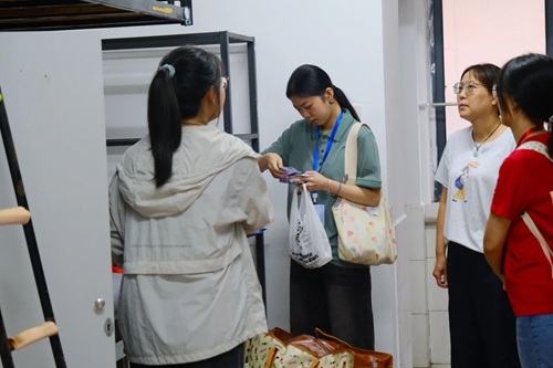 迎新大本营集合,等候各位新生以及家长的到来。他们带着热情的笑容接过家长手中的各类行李物品,或一同推车,或协力搬运。同时,在步行至宿舍的途中,也不忘为好奇的小萌新们指出园区内的育人空间自习室以及食堂、超市、快递站的位置,帮助同学们尽快熟悉校园环境。