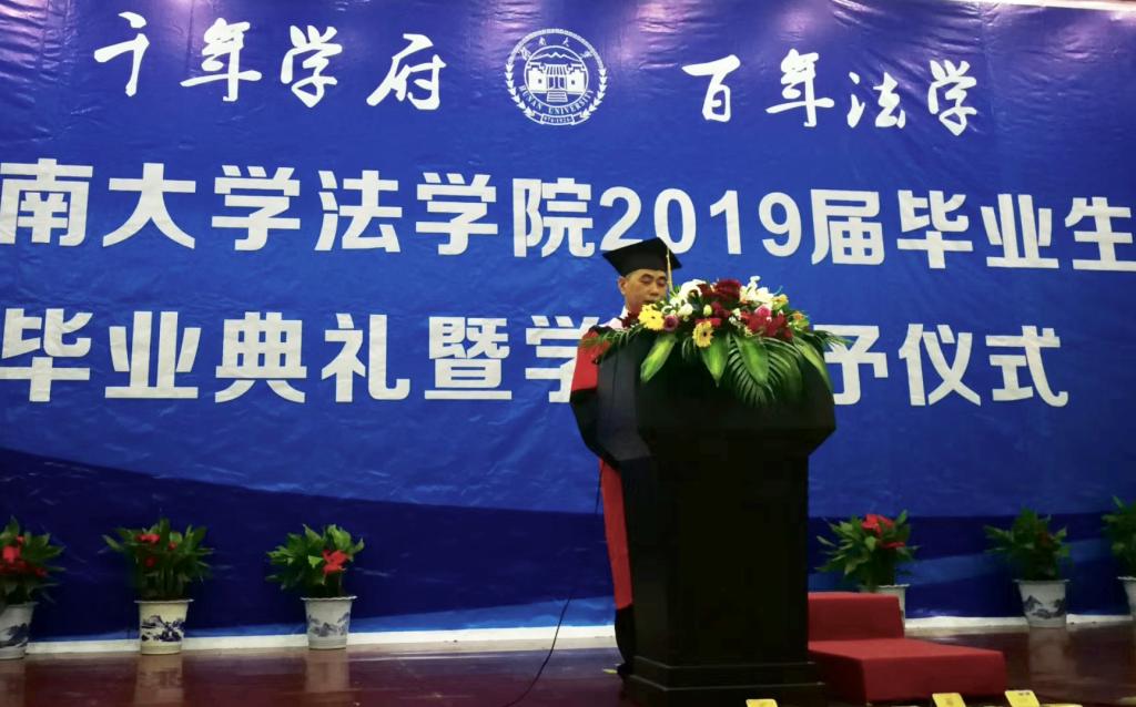 紧接着毕业生代表曾亚发言,曾亚同学深切表达了对学院提供的良好学习平台、师长们的谆谆教诲的感激之情和对蓬勃向上、携手共进的同窗们的不舍之情。并且,她表示在进入社会之后,毕业生们便代表着学院形象,与学院共荣辱,只有不断提升个人能力、实现自我价值,才是对学院对最好反馈。一切过往,皆为序章。曾亚同学最后呼吁所有毕业生努力实现个人价值,勇于担当社会责任,用行动和奋斗书写无愧于湖大法学人对华彩篇章。
