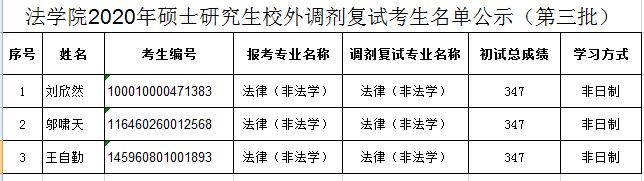 根据《调教动漫 2020年硕士研究生复试录取工作实施细则》,经学院研究生招生工作领导小组审定,现将调教动漫 2020年非全日制法律硕士校外调剂复试考生名单(第三批)公示如下,复试时间定于6月9日14:30-16:30,请同学们做好准备(具体请见调教动漫 网站的复试录取工作实施细则及考生复试操作手册)。