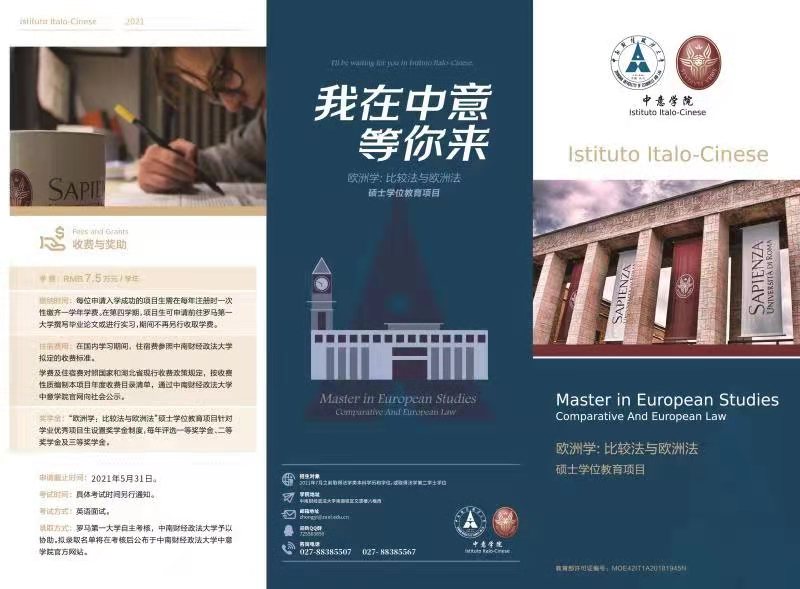 “欧洲学:比较法与欧洲法”硕士学位教育项目由中南财经政法大学与意大利罗马第一大学合作创办,并于2019年4月获得中华人民共和国教育部批准(批准书编号:MOE42IT1A20181945N)。项目旨在健全创新法治人才培养机制,育就国际一流法律人才,培养面向现代化、面向世界、面向未来,德、智、体、美全面发展,具有创新精神和全球视野,有能力从事涉外法律实务工作和研究国际前沿法学理论问题的专门人才。
