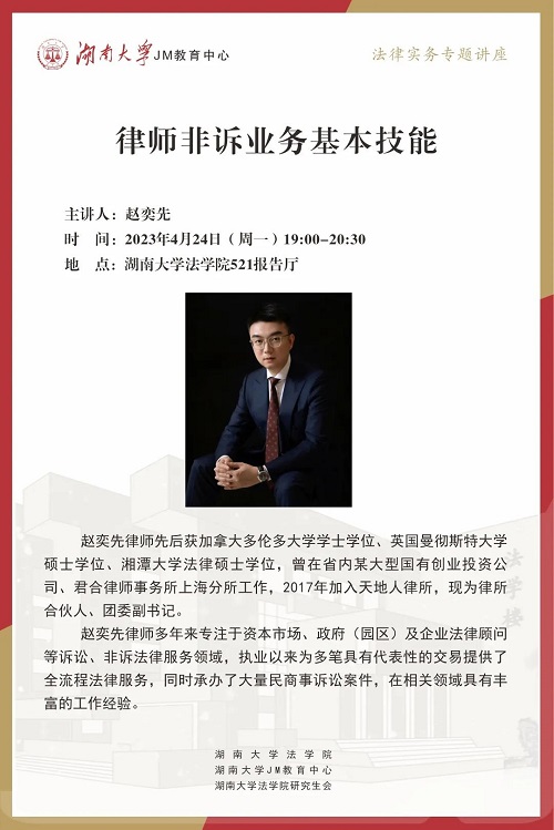 近期,中共中央办公厅、国务院办公厅印发《关于加强新时代法学教育和法学理论研究的意见》(以下简称《意见》),《意见》指出法学教育和法学理论研究承担着为法治中国建设培养高素质法治人才、提供科学理论支撑的光荣使命,在推进全面依法治国中具有重要地位和作用。为切实贯彻落实《意见》精神,学院将与各实践单位合作开展法律实务系列讲座。本次JM实务讲座将由湖南天地人律所的赵奕先律师为大家分享律师非诉业务的基本技能。对想了解律师职业的同学来说,这将是一堂打开视野、打开认知格局的实务课,快来积极参与吧!