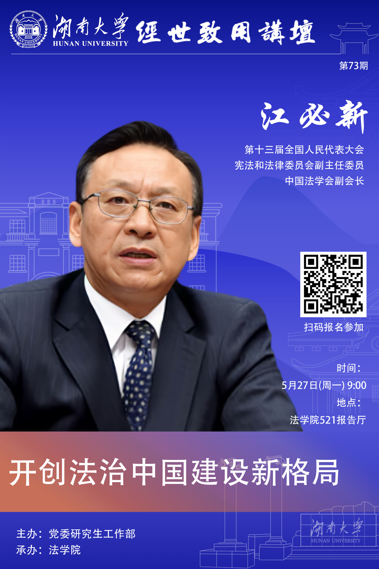521报告厅作“开创法治中国建设新格局”主题报告,欢迎同学们踊跃参加。
