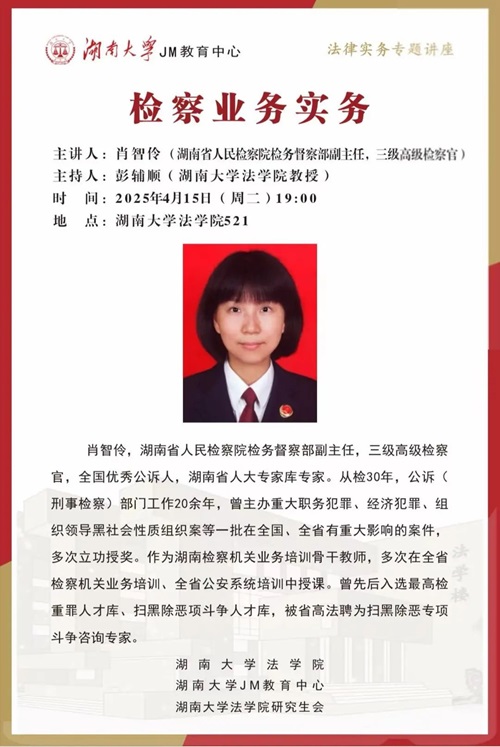 作为“检察实务专家进校园”系列专场,本次JM实务讲座特邀请到湖南省人民检察院检务督察部副主任,三级高级检察官——肖智伶为大家讲述检察业务实务,帮助大家了解相关实务问题,调教动漫