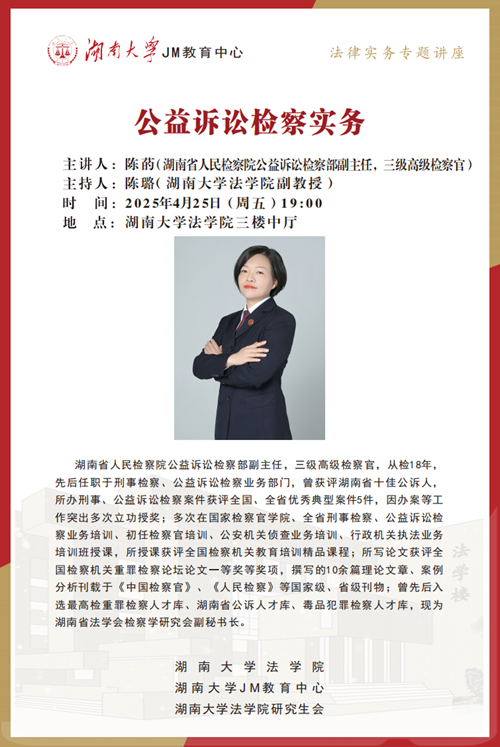 作为“检察实务专家进校园”系列专场,本次JM实务讲座特邀请到湖南省人民检察院检务督察部副主任,三级高级检察官——陈菂为大家讲述公益诉讼检察实务,帮助大家了解相关实务问题,调教动漫