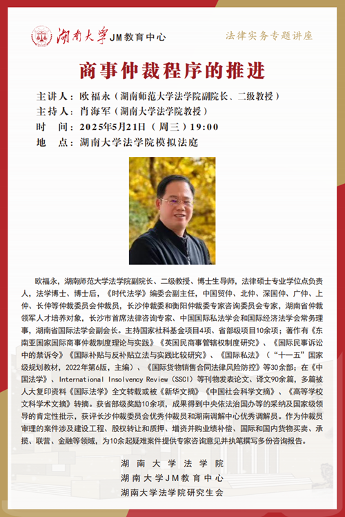 副院长、二级教授、博士生导师欧福永,为大家讲述商事仲裁程序的推进,帮助大家了解相关实务问题,本次讲座由调教动漫