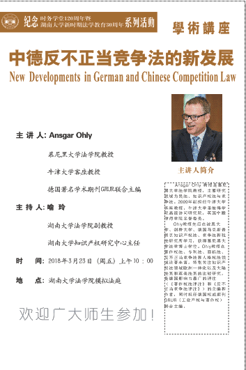 Ohly教授先后在波恩大学、剑桥大学、德国马克斯普朗克知识产权法、竞争法和税法研究所学习,获得慕尼黑大学法学博士学位。Ohly教授在著作权法、专利法、商标法、反不正当竞争法和人格权法领域论著丰富,特别关注知识产权法领域欧洲一体化以及大陆法系和英美法系的比较研究,是德国影响力最广的评注(《著作权法评注》和《反不正当竞争法评注》)的主编和作者,同时担任德国权威期刊GRUR(工业产权与著作权)联合主编。