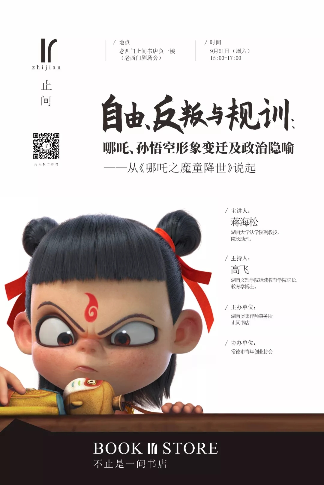 2019年9月21日下午,蒋海松受邀来到常德,在止间书店(常德)以《自由、反叛与规训:哪吒、孙悟空形象变迁及政治隐喻——从<哪吒之魔童降世>说起》为题,同常德的书友们一道分享了哪吒形象的历史变迁背后的文化故事。