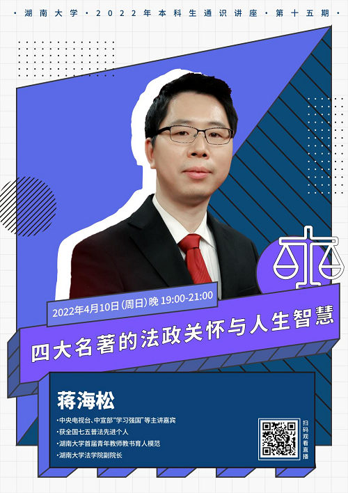 副院长蒋海松副教授以“四大名著的法政关怀和人生智慧”为主题,为大家带来了一场别开生面的法律盛宴。本次讲座由调教动漫