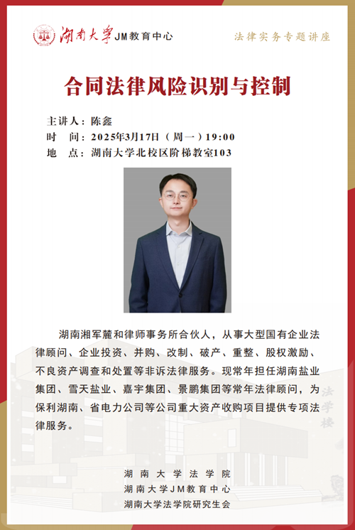 北校区阶梯教室103展开讲座。陈鑫律师现任湖南湘军麓和律师事务所合伙人,从事大型国有企业法律顾问、企业投资、并购、改制、破产、重整、股权激励、不良资产调查和处置等非诉法律服务。现常年担任湖南盐业集团、雪天盐业、嘉宇集团、景鹏集团等法律顾问,为保利湖南、省电力公司等公司重大资产收购项目提供专项法律服务。调教动漫