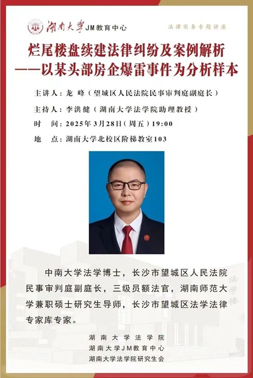 01:参加完龙峰法官主讲的JM实务讲座,我收获颇丰。龙法官以某头部房企爆雷事件为切入点,对烂尾楼盘续建法律纠纷进行深度剖析,这种结合实际案例的讲解,让复杂的法律问题变得清晰易懂。通过讲座,我认识到烂尾楼盘续建纠纷涉及多方利益,包括购房者、施工方、银行等,背后的法律关系盘根错节。龙法官在分享相关案例时,不仅阐释了法律条文的适用,还讲解了司法实践中的处理思路和技巧,为我们今后解决此类问题提供了宝贵的借鉴。这次讲座不仅丰富了我的法律知识储备,更重要的是培养了我解决实际法律问题的思维方式。在今后的学习与工作中,我会把从讲座中学到的知识运用到实践里,持续关注烂尾楼续建这一社会热点问题,不断提高自己处理复杂法律事务的能力,为推动行业健康发展贡献一份力量 。