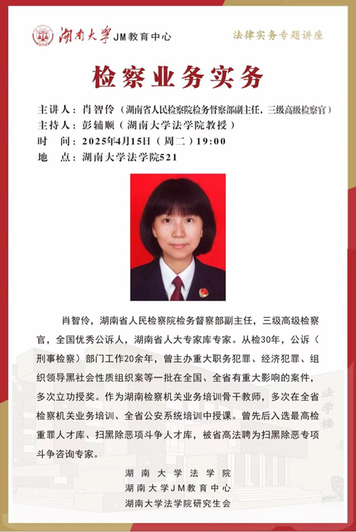 2025年4月15日19:00,湖南省人民检察院检务督察部副主任,三级高级检察官肖智伶在湖大521教室开讲“检察业务实务”,调教动漫