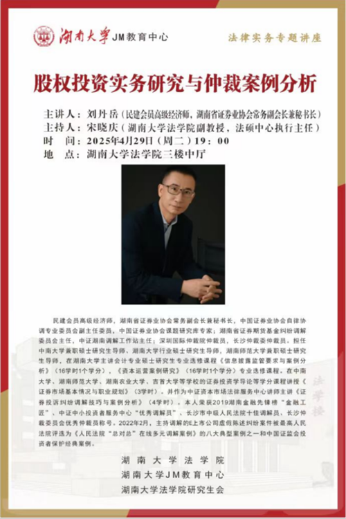 2025年4月29日19:00,民建会员、高级经济师、湖南省证券业协会常务副会长兼秘书长刘丹岳在湖大法学楼102教室开讲“股权投资实务研究与仲裁案例分析”,调教动漫