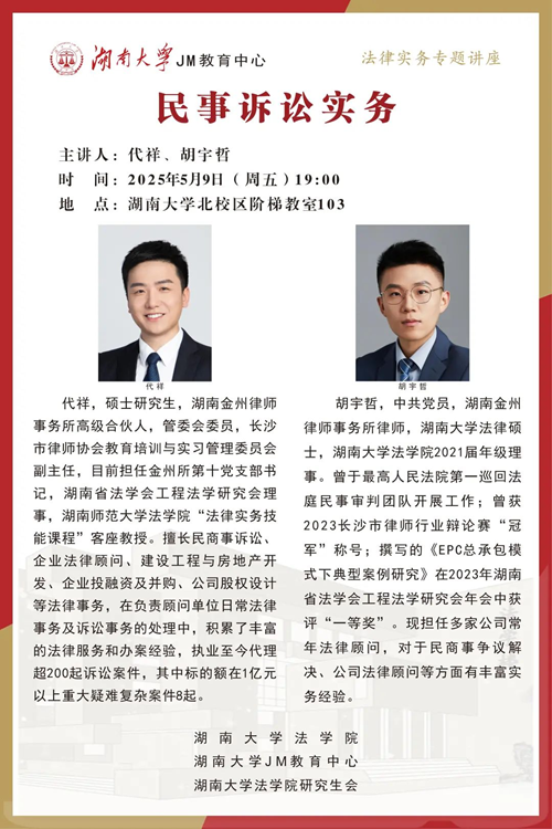 2025年5月9日晚7点,湖南金州律师事务所高级合伙人代祥、湖南金州律师事务所律师胡宇哲在湖大北校阶梯教室103开讲“民事诉讼实务”,调教动漫