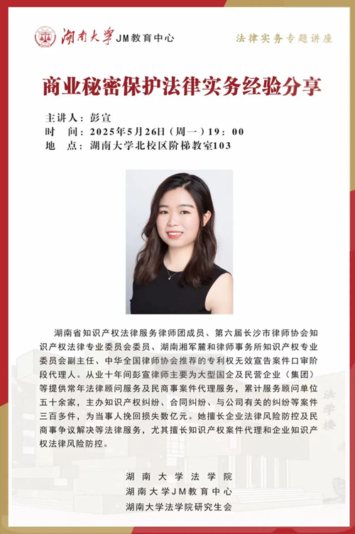 2025年5月26日晚七点,JM实务讲座邀请到湖南湘军麓和律师事务所二级合伙人、知识产权专业委员会副主任彭宣律师,为大家做了商业秘密保护法律实务经验分享,帮助大家了解相关实务问题。调教动漫