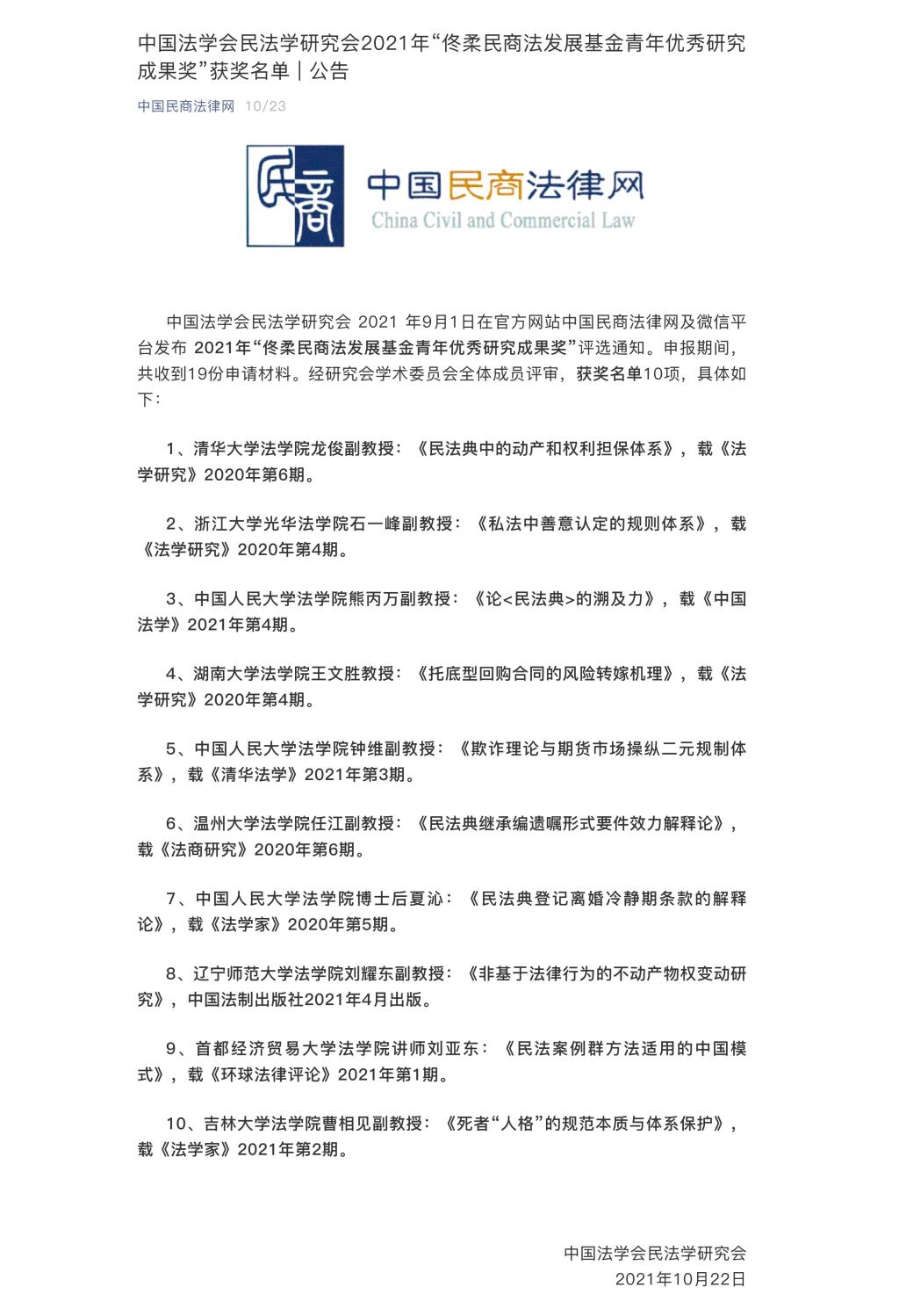 2021年10月22日,中国法学会民法学研究会在官方网站中国民商法律网及微信公众号公布了2021年“佟柔民商法发展基金青年优秀研究成果奖”获奖名单,调教动漫