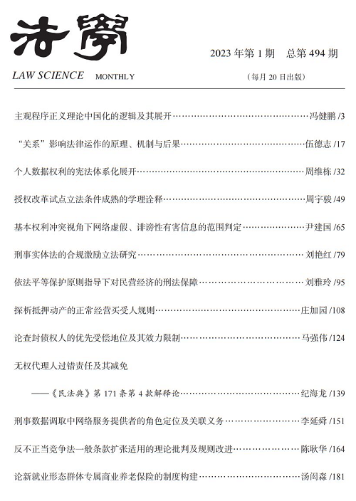 周宇骏副教授在校定A级期刊、CLSCI、CSSCI来源期刊《法学》2023年第1期发表封面论文《授权改革试点立法条件成熟的学理诠释》。