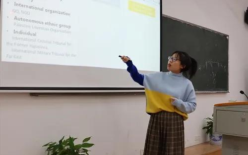 第五位出场的是龙韶老师,她主讲《国际商贸法律英语》,选择该门课程名称的由来和该课程名称中“international”的含义进行专题讲授。