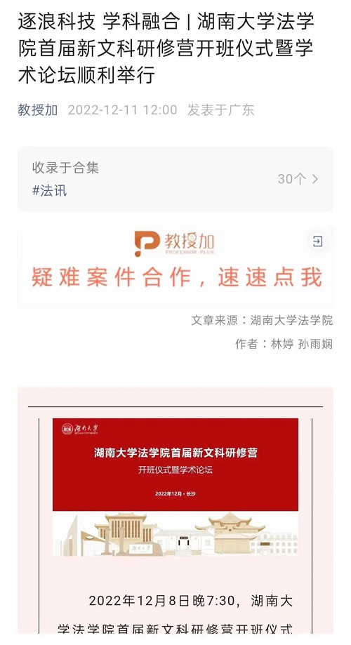 首届新文科研修营开班》,《法治日报·法治周末》推出报道《法学教育如何应对新文科》,知名法学公众号“法学学术前沿”推出报道《学界 | 全国法学界第1个新文科研修营 调教动漫