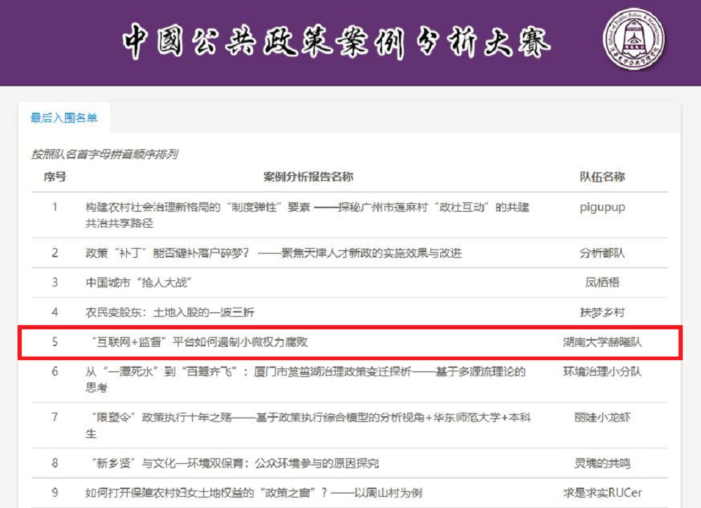 多位老师的悉心指导,进一步明确了研究思路、研究方法。6月6日,案例选题报告《“互联网+监督”惩治基层小微权力腐败研究—以湖南麻阳为个案 》提交大赛组委会。6月21日,赫曦队选题从全国497支高校队伍中脱颖而出,顺利晋级实地调研阶段。