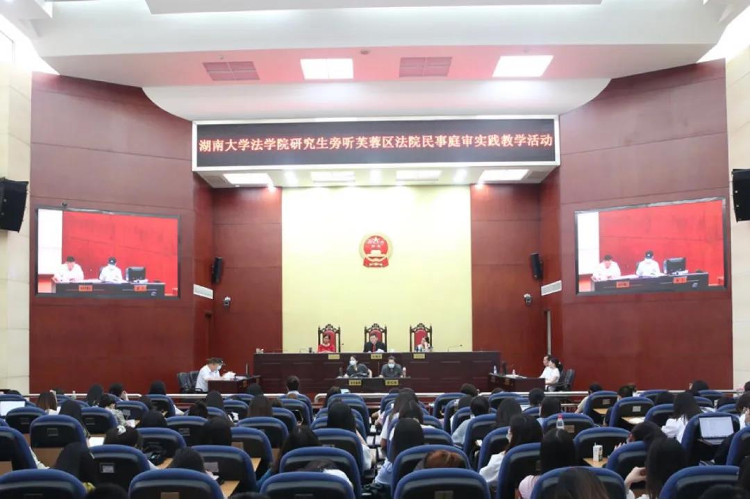 150名研究生在陈锦红副教授、袁坦中老师的带领下,来到芙蓉区法院开展实践教学活动,旁听一起合同纠纷案件的庭审。芙蓉区法院民事审判二庭庭长谭今法官担任审判长并主审案件。