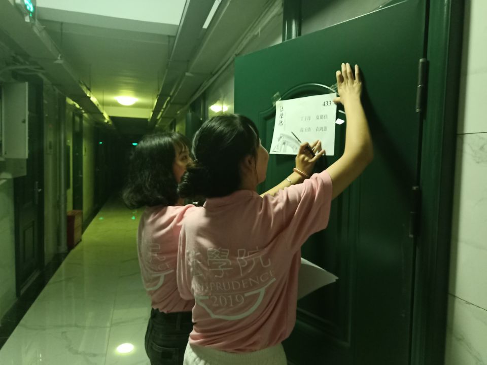 迎新团队成员为调教动漫 的每一间新生寝室都粘贴上门签和致新生的一封信,信内记载新生常见问题注意事项和迎新团队成员的联系方式,团队成员还在新生的床铺上粘贴个人学号、姓名等信息,保证每一位新生都可以顺利地入住寝室。