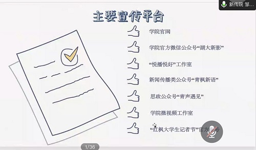 依据专业特点发布“法言法语”系列文章,用法律知识解读时事热点;新传院则依托红枫大学生记者节等品牌活动在腾讯微视、微博等多个平台采用多种多样的形式开展宣传工作。