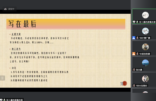 本次交流会历时近三小时,学长学姐的历程分享和经验传授既是榜样引领,也令同学们对考研的备考历程和方法技巧有了更加清晰的认识。“鲜衣怒马少年时,不负韶华行且知。”2019级同学们,一“研”为定。