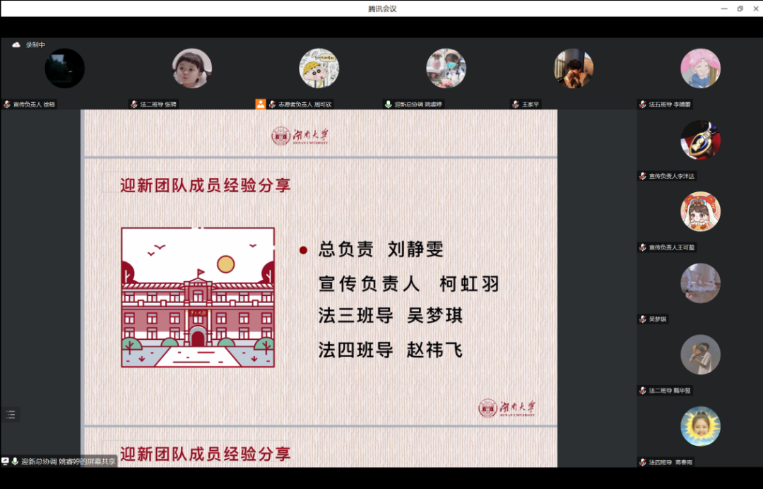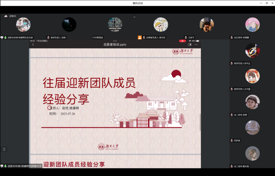 2023年7月26日,法学2023级迎新团队举行“往届迎新团队成员经验分享”会议。本次会议由2023级迎新团队总协调姚睿婷同学主持,迎新团队全体成员以及往届优秀迎新团队成员参加会议。