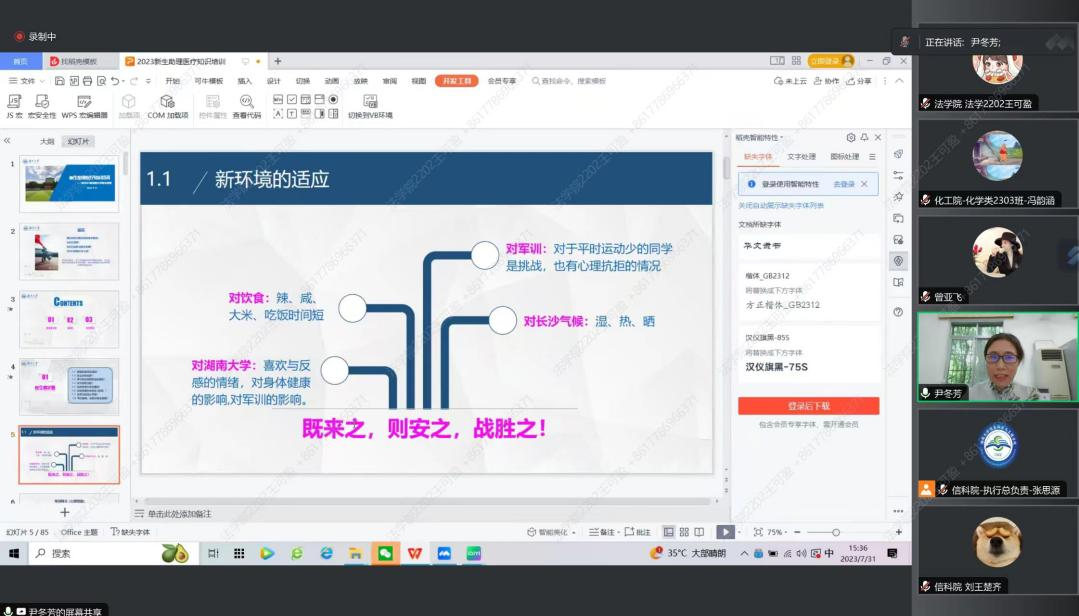 本次讲座分为三个部分:新生需求篇、急救篇以及传染病篇。在新生需求部分,尹老师着重强调了对新环境的适应,要做到既来之,则安之,战胜之。此外,尹老师还对疫苗注射、学生医保的使用以及军训免训手续的办理做了详细讲解。