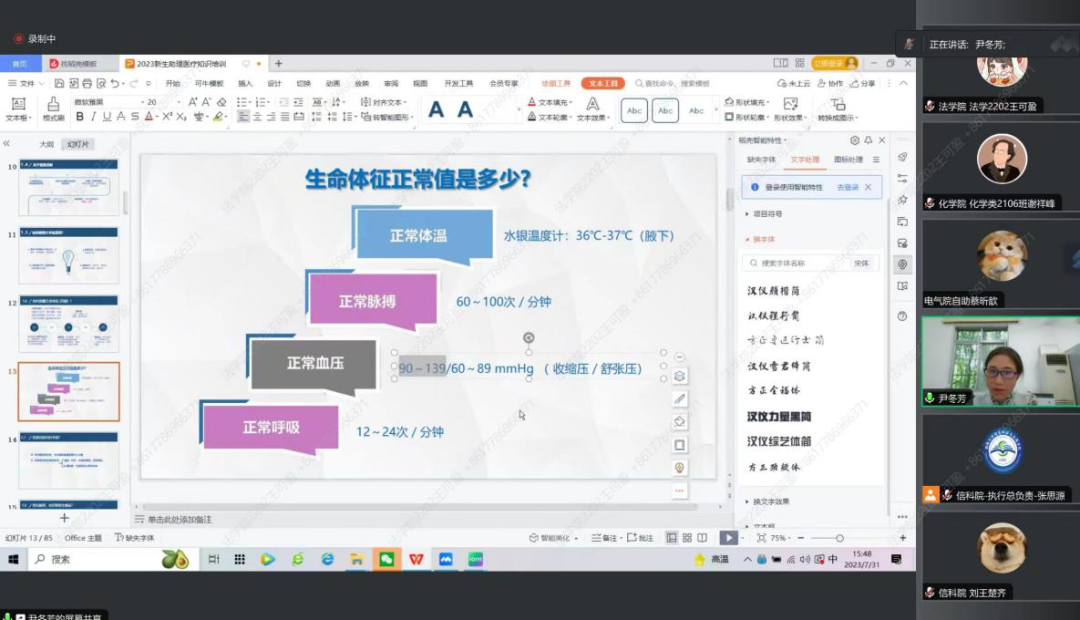 2023级迎新团队与各学院共同开展医疗知识培训。本次培训由校医院尹冬芳老师主持,2023级迎新团队全体成员参加。
