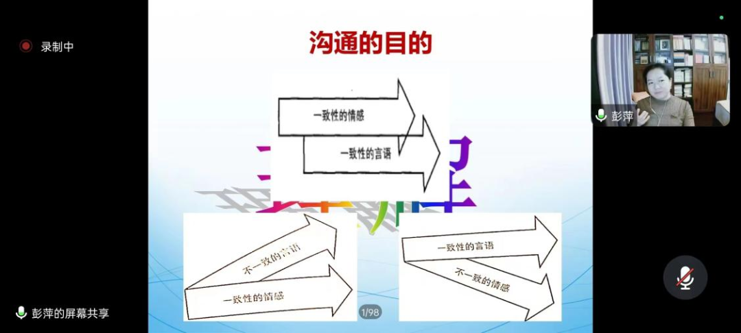 而后,彭萍老师对深度谈心谈话技巧进行了专门讲解。她以心理学上的人际互动系统和人际沟通的简单模型引出沟通的目的。并通过对助人为乐的定义以及本质的分析,引出深度谈心谈话的沟通要求。进而将其具化为与新生建立深层关系的四个步骤。最后,彭老师介绍了谈心谈话的技术与方法,并对相关效果进行了评估。