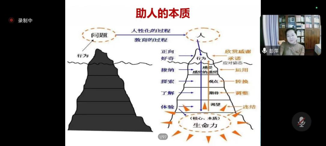 首先,彭萍老师对心理学的相关背景知识进行了介绍。分别讲解了人文主义心理学思想、积极心理学思想的基本概念以及核心内容。并以此为基础,介绍了六大美德和24种积极的人格品质。最终引出“问题不是问题,如何应对才是问题”的心理学方法论。