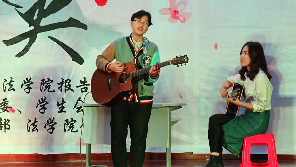赫曦映岳麓山,青春跃星城,17级行管一班全体同学模仿高中时代的校园电视台,为观众们奉上了活力四射的舞蹈《悦动青春》,瞬间点燃了场内气氛。17级法学三班孙鹏翔、陈佳、马若琳等同学主演的舞台剧《法三的秘密》用cosplay的方式演绎流行游戏,精彩的表演为观众们带来了阵阵欢笑。情牵法韵,流年似水,17级法学四班的歌舞节目《四水年华》用华美的舞蹈与动听的音乐和观众们一同追忆似水年华、展望美好未来。有一种故事叫做爱情,有一种流行叫做穿越,17级行管二班苏哲豪、胡鑫雅等同学主演的话剧《假如爱有天意》将二者完美结合,描绘了一场唯美而有趣的爱情故事。