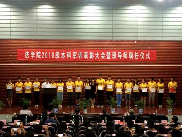 2016级新生军训表彰决定》,法学1605班、行管1602班被授予“军训优胜队列班”荣誉称号,法学1601班、法学1604班被授予“内务评比先进班级”,法学1602班、法学1603班、行管1601班被授予“军训作风纪律先进班级”荣誉称号,天马二区一栋331寝室等10个寝室被授予军训内务评比“优秀寝室”,马有翼、崔一帆等35人被授予“军训先进个人”。学院领导和老师、全体教官为获奖的优秀集体、个人颁发了荣誉证书。