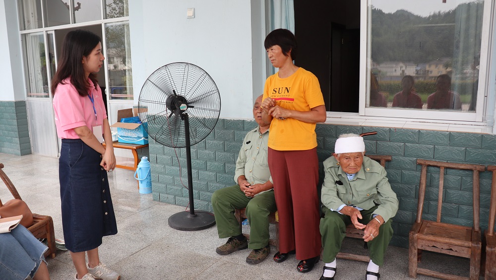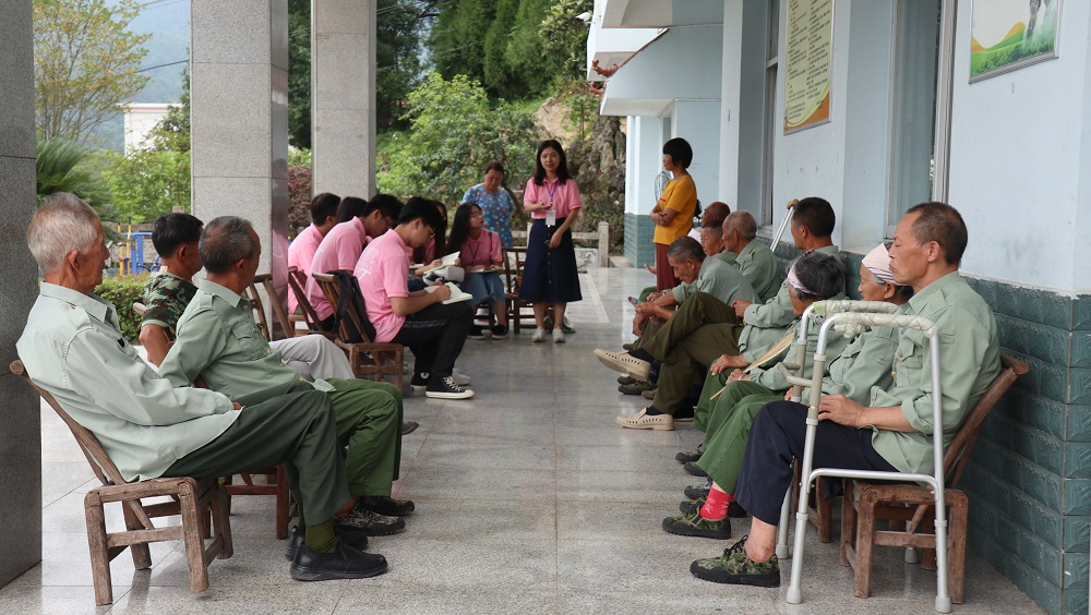 下午,团队一行来到桑植县洪家关光荣院。洪家关光荣院建院至今61年,经历了两任院长,第一位是“全国三八红旗手”顾菊香,第二位是现任院长、“全国岗位学雷锋标兵”贺晓英。在与贺晓英院长的交谈中我们了解到,生活在光荣院里的有老红军、老赤卫队员、老八路、老战士和烈士的亲属,老人们的平均年龄为75.6岁,最为年长的老人已达90岁,平均寿终年龄都在80岁以上。贺院长24岁来到光荣院,已经在院里度过了33个春秋,她陪伴一个又一个老人度过人生最后的岁月,将最美好的青春年华都奉献给了光荣院,在贺院长眼里,这是一份责任、一种传承,她毫无怨言,几十年如一日。“光荣院长贺晓英,她对我们最关心。虽然不是亲生女,她比亲人还要亲。”抗美援朝老兵谭泽然编写的这段顺口溜,真实地表达了老人们的共同心声。